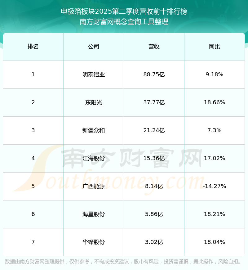 按照南方財富網(wǎng)概念查詢工具統(tǒng)計,該股所屬板塊為電極箔板塊,該板塊共有7只股票,東陽光2025第二季度營收在該板塊中排名為第2名,該板塊2025第二季度營收排名前十的股票如下表: