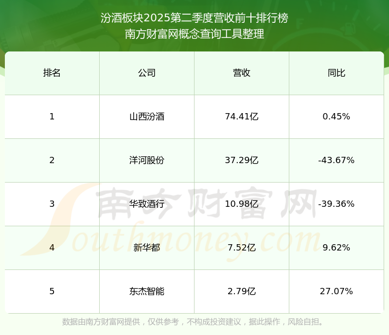 按照南方財(cái)富網(wǎng)概念查詢工具統(tǒng)計(jì),該股所屬板塊為汾酒板塊,該板塊共有5只股票,山西汾酒2025第二季度營收在該板塊中排名為第1名,該板塊2025第二季度營收排名前十的股票如下表: