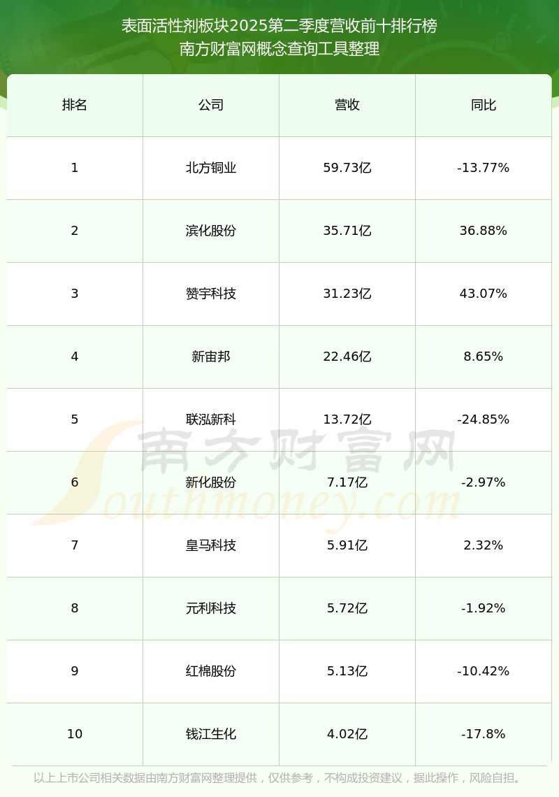 按照南方財(cái)富網(wǎng)概念查詢工具統(tǒng)計(jì),該股所屬板塊為表面活性劑板塊,該板塊共有14只股票,皇馬科技2025第二季度營(yíng)收在該板塊中排名為第7名,該板塊2025第二季度營(yíng)收排名前十的股票如下表: