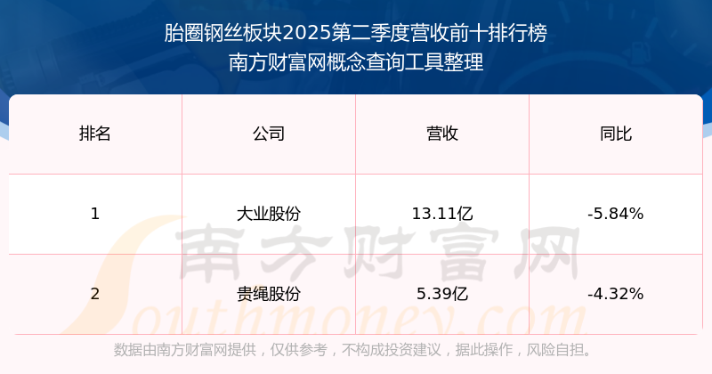 按照南方財富網(wǎng)概念查詢工具統(tǒng)計,該股所屬板塊為胎圈鋼絲板塊,該板塊共有2只股票,大業(yè)股份2025第二季度營收在該板塊中排名為第1名,該板塊2025第二季度營收排名前十的股票如下表:
