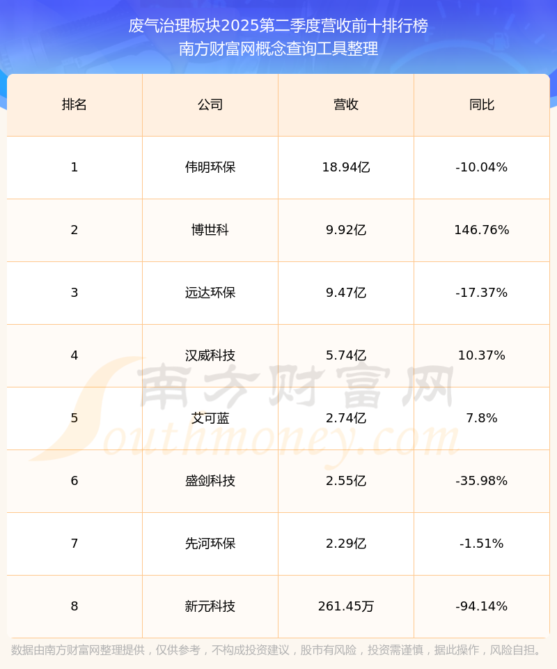 按照南方財富網(wǎng)概念查詢工具統(tǒng)計,該股所屬板塊為廢氣治理板塊,該板塊共有8只股票,盛劍科技2025第二季度營收在該板塊中排名為第6名,該板塊2025第二季度營收排名前十的股票如下表: