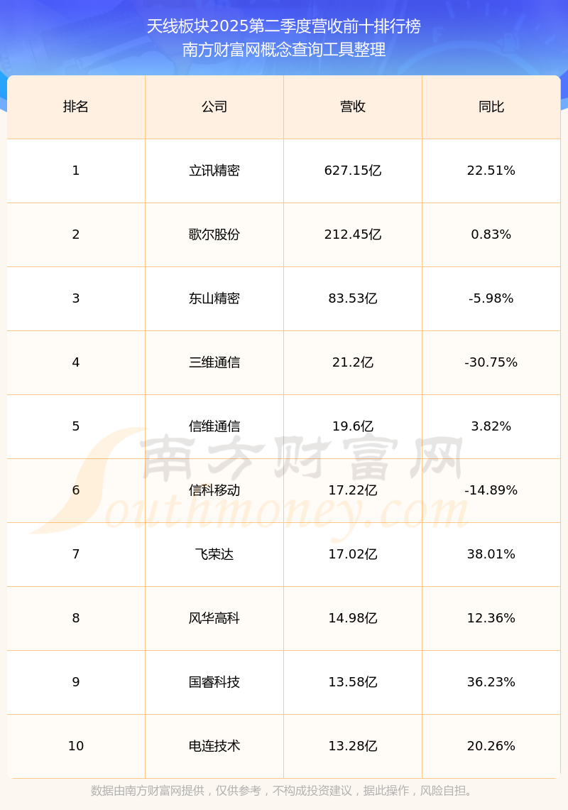 按照南方財(cái)富網(wǎng)概念查詢工具統(tǒng)計(jì),該股所屬板塊為天線板塊,該板塊共有38只股票,移遠(yuǎn)通信2025第二季度營收在該板塊中排名為第38名,該板塊2025第二季度營收排名前十的股票如下表: