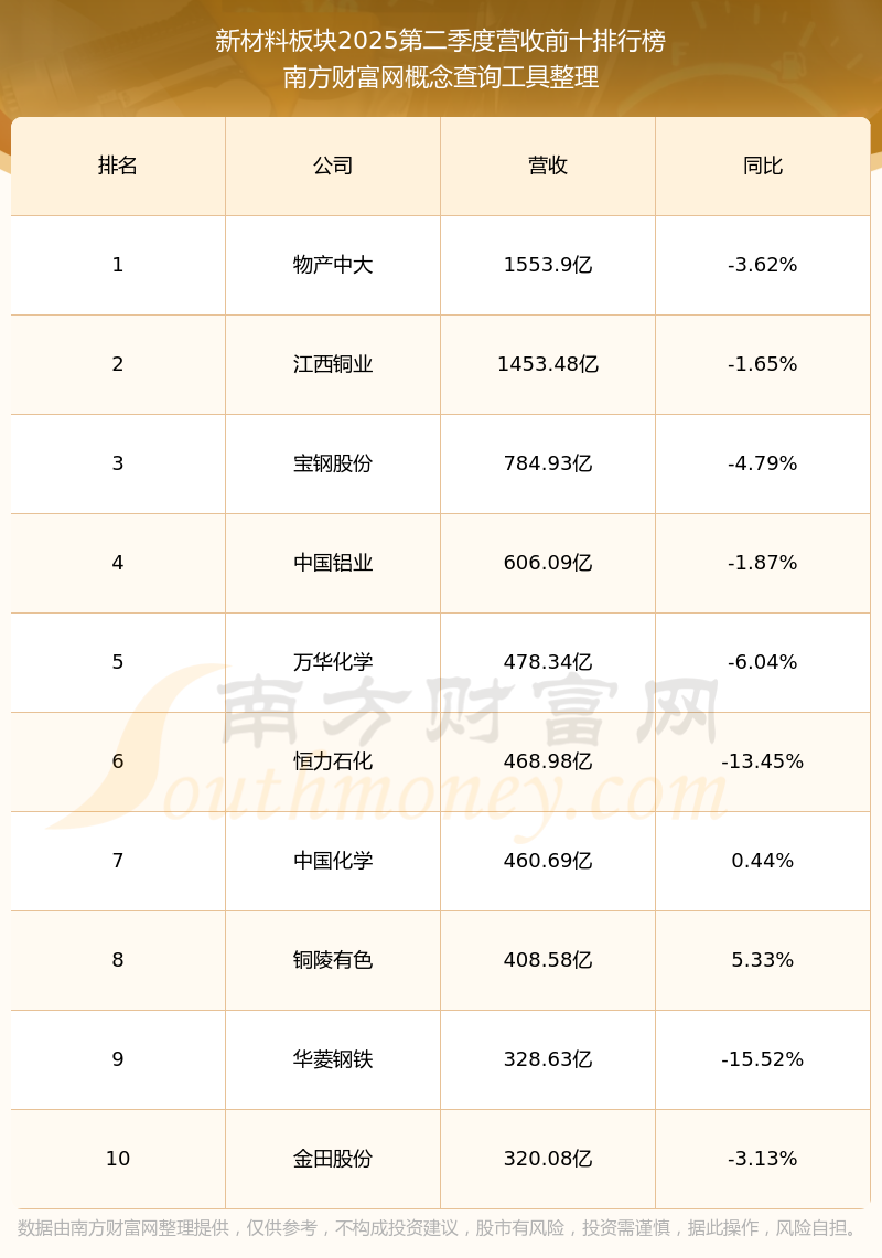 按照南方財(cái)富網(wǎng)概念查詢(xún)工具統(tǒng)計(jì),該股所屬板塊為新材料板塊,該板塊共有562只股票,佳馳科技2025第二季度營(yíng)收在該板塊中排名為第454名,該板塊2025第二季度營(yíng)收排名前十的股票如下表: