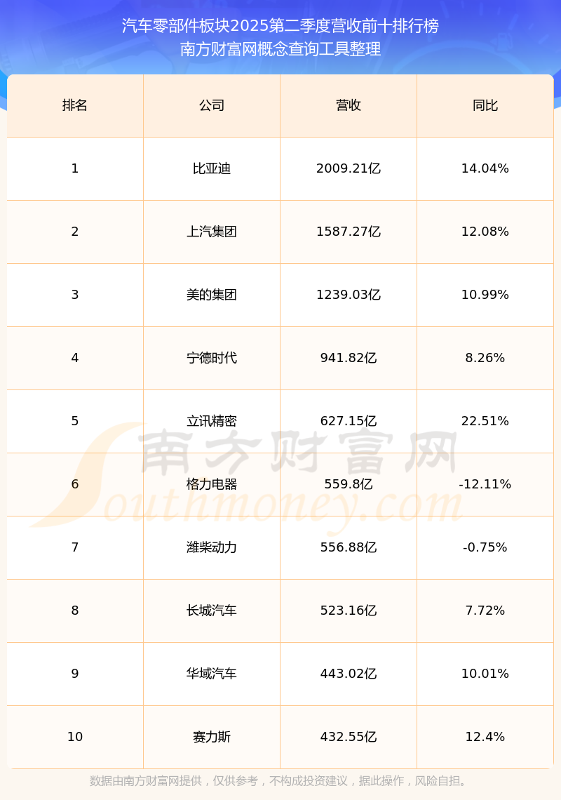 按照南方財富網(wǎng)概念查詢工具統(tǒng)計,該股所屬板塊為汽車零部件板塊,該板塊共有567只股票,愛柯迪2025第二季度營收在該板塊中排名為第126名,該板塊2025第二季度營收排名前十的股票如下表:
