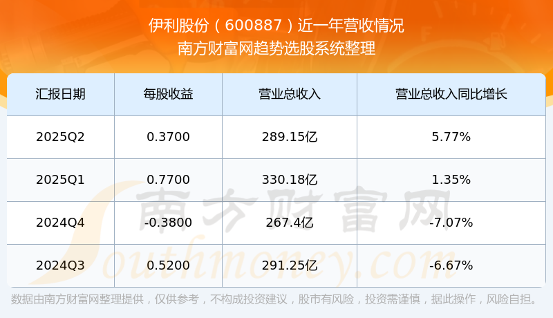 伊利股份2025年第二季度顯示,公司主營收入289.15億元,同比5.77%;歸母凈利潤23.26億元,同比44.65%;扣非凈利潤23.87億元,同比49.48%。
