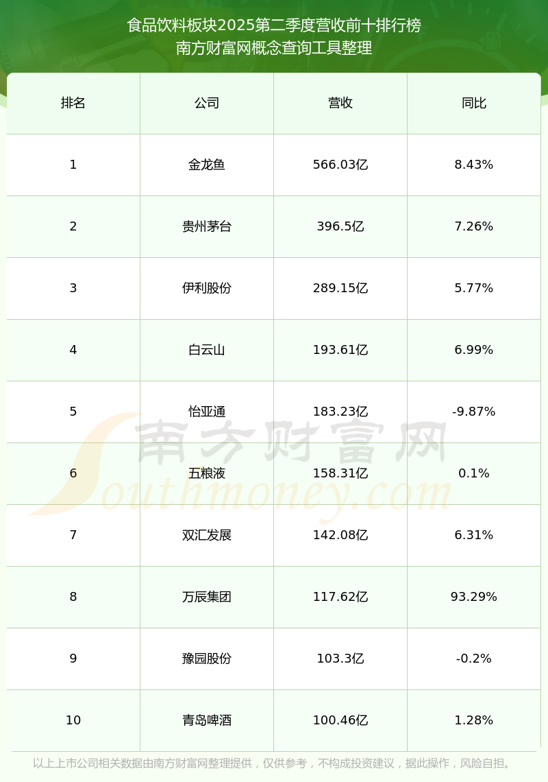 按照南方財(cái)富網(wǎng)概念查詢工具統(tǒng)計(jì),該股所屬板塊為食品飲料板塊,該板塊共有243只股票,伊利股份2025第二季度營收在該板塊中排名為第3名,該板塊2025第二季度營收排名前十的股票如下表: