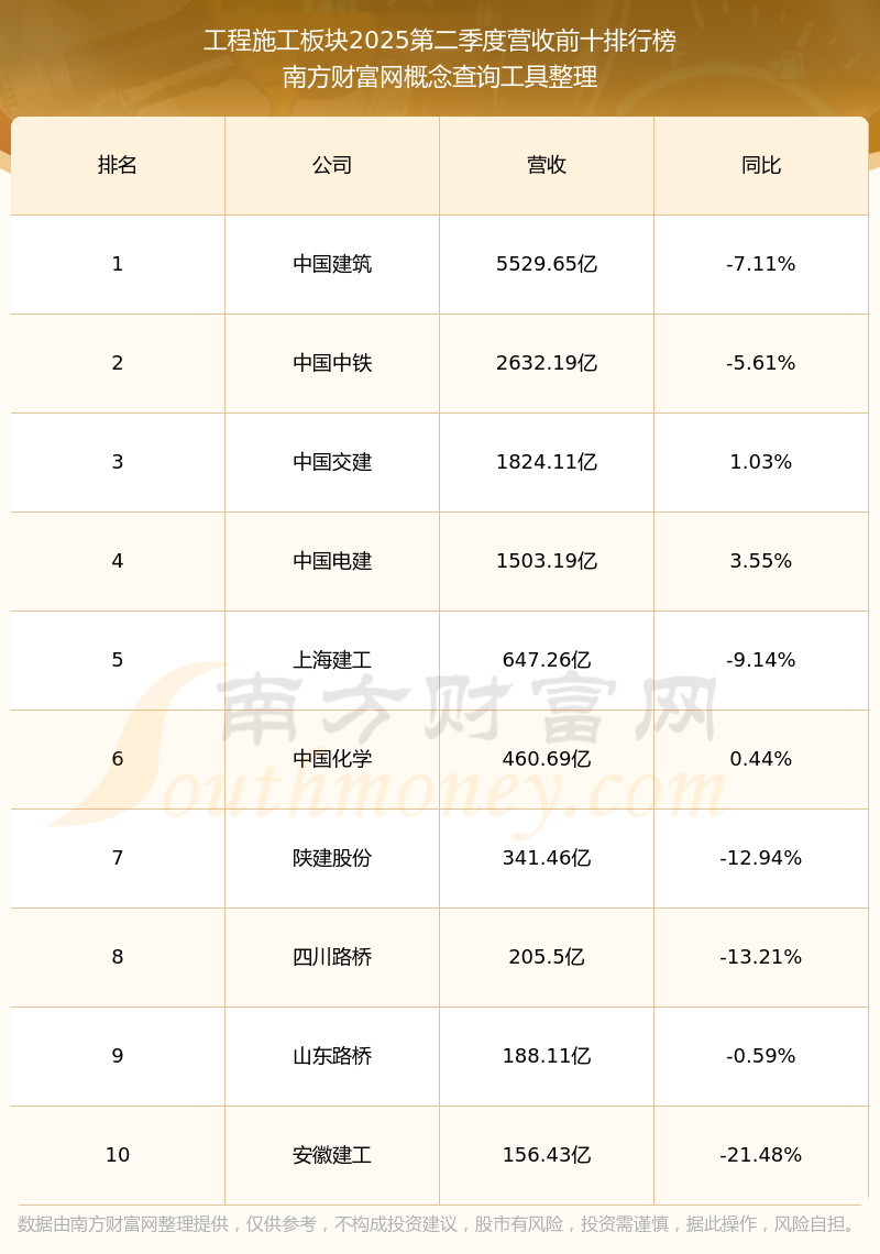 按照南方財(cái)富網(wǎng)概念查詢工具統(tǒng)計(jì),該股所屬板塊為工程施工板塊,該板塊共有56只股票,正和生態(tài)2025第二季度營(yíng)收在該板塊中排名為第56名,該板塊2025第二季度營(yíng)收排名前十的股票如下表: