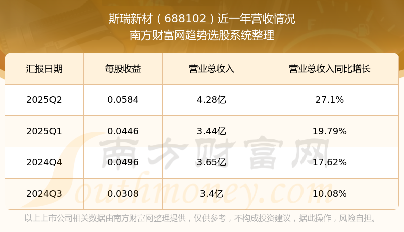 斯瑞新材2025年第二季度財(cái)報(bào)顯示,公司主營(yíng)收入4.28億元,同比27.1%;歸母凈利潤(rùn)4240.86萬元,同比35.18%;扣非凈利潤(rùn)4253.68萬元,同比42.7%;