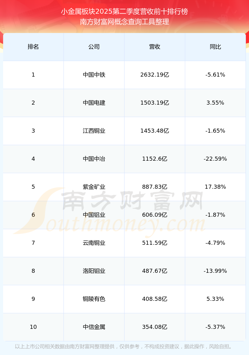按照南方財(cái)富網(wǎng)概念查詢工具統(tǒng)計(jì),該股所屬板塊為小金屬板塊,該板塊共有173只股票,華陽新材2025第二季度營收在該板塊中排名為第170名,該板塊2025第二季度營收排名前十的股票如下表: