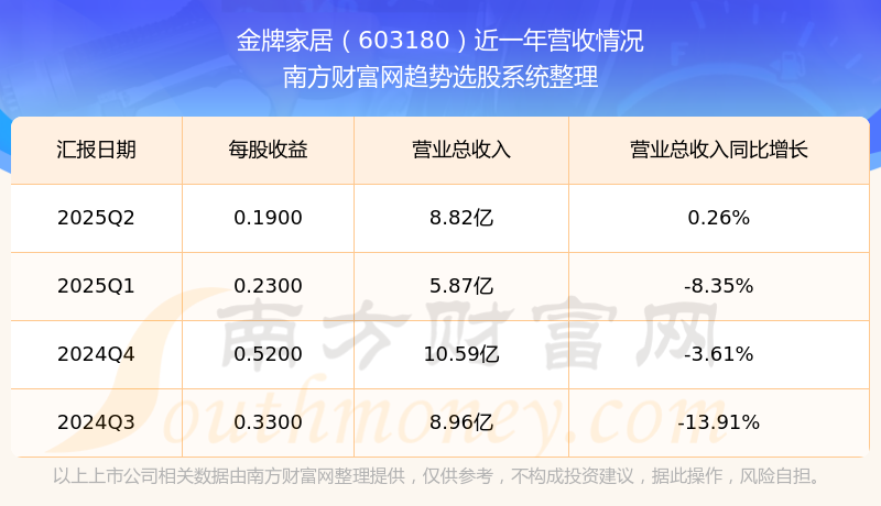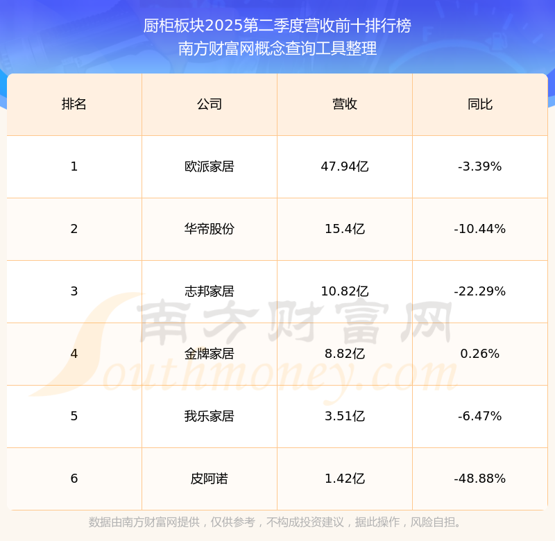 按照南方財富網(wǎng)概念查詢工具統(tǒng)計,該股所屬板塊為廚柜板塊,該板塊共有6只股票,金牌家居2025第二季度營收在該板塊中排名為第4名,該板塊2025第二季度營收排名前十的股票如下表: