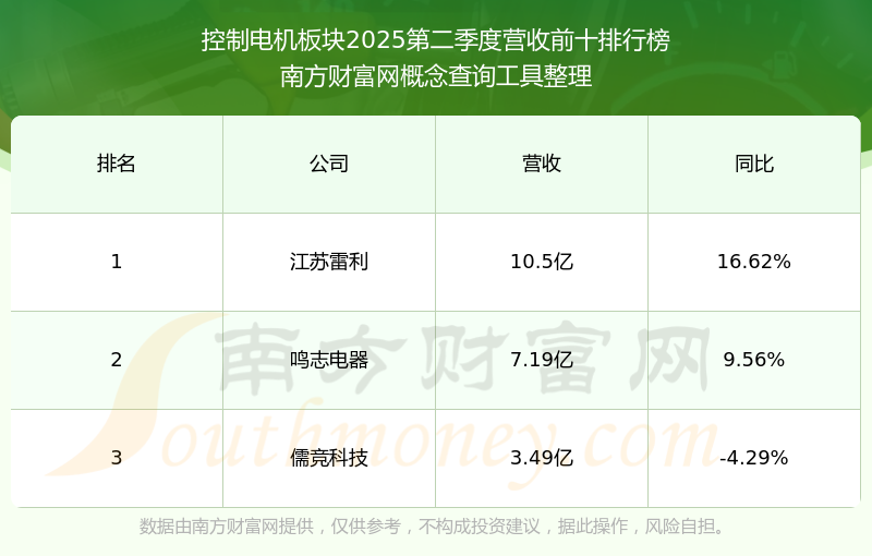 按照南方財(cái)富網(wǎng)概念查詢工具統(tǒng)計(jì),該股所屬板塊為控制電機(jī)板塊,該板塊共有3只股票,鳴志電器2025第二季度營收在該板塊中排名為第2名,該板塊2025第二季度營收排名前十的股票如下表: