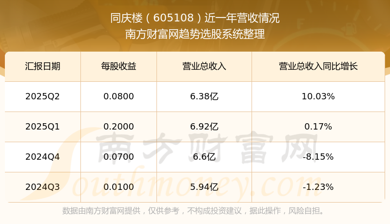 同慶樓發(fā)布2025年第二季度財報。實現(xiàn)總營收6.38億元,同比增長10.03%;扣非凈利潤同比增長74.14%至1940.68萬元。