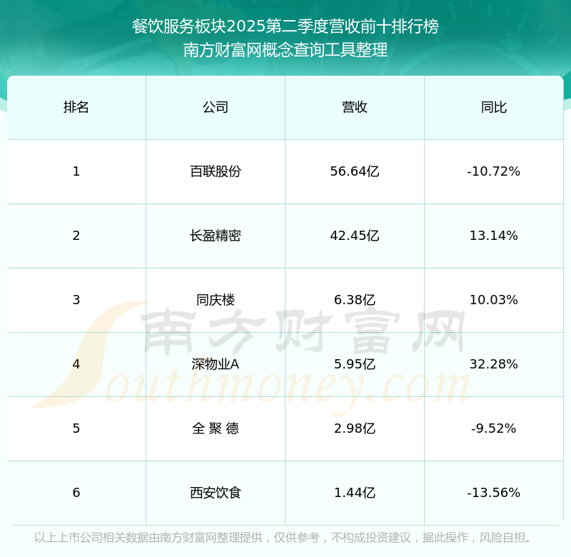 按照南方財富網(wǎng)概念查詢工具統(tǒng)計,該股所屬板塊為餐飲服務板塊,該板塊共有6只股票,同慶樓2025第二季度營收在該板塊中排名為第3名,該板塊2025第二季度營收排名前十的股票如下表: