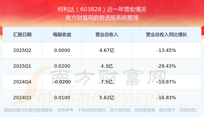 柯利達(dá)2025年第二季度顯示,公司主營收入4.67億元,同比-13.45%;歸母凈利潤-271.83萬元,同比51.26%;扣非凈利潤-2565.6萬元,同比-163.67%。