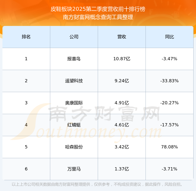 按照南方財富網(wǎng)概念查詢工具統(tǒng)計,該股所屬板塊為皮鞋板塊,該板塊共有6只股票,哈森股份2025第二季度營收在該板塊中排名為第5名,該板塊2025第二季度營收排名前十的股票如下表: