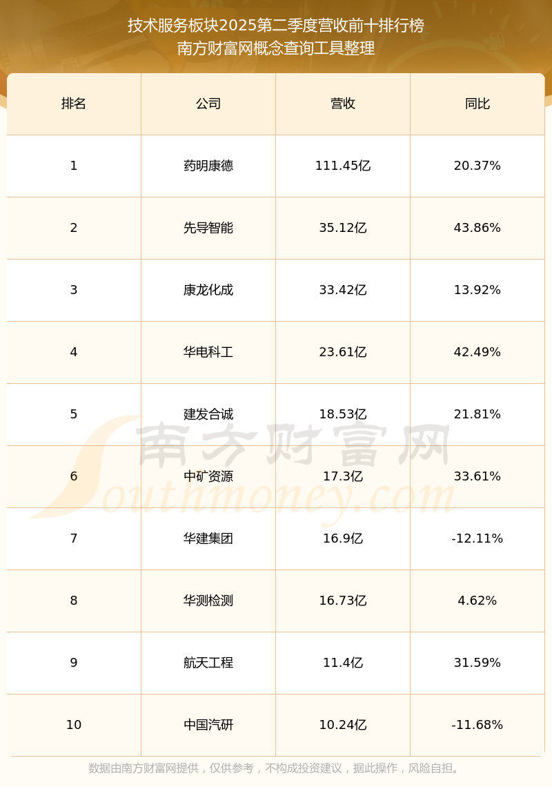 按照南方財(cái)富網(wǎng)概念查詢工具統(tǒng)計(jì),該股所屬板塊為技術(shù)服務(wù)板塊,該板塊共有54只股票,中國電研2025第二季度營收在該板塊中排名為第54名,該板塊2025第二季度營收排名前十的股票如下表: