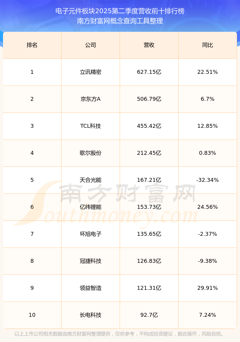 按照南方財富網(wǎng)概念查詢工具統(tǒng)計,該股所屬板塊為電子元件板塊,該板塊共有354只股票,生益科技2025第二季度營收在該板塊中排名為第17名,該板塊2025第二季度營收排名前十的股票如下表: