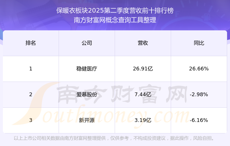 按照南方財(cái)富網(wǎng)概念查詢(xún)工具統(tǒng)計(jì),該股所屬板塊為保暖衣板塊,該板塊共有3只股票,愛(ài)慕股份2025第二季度營(yíng)收在該板塊中排名為第2名,該板塊2025第二季度營(yíng)收排名前十的股票如下表: