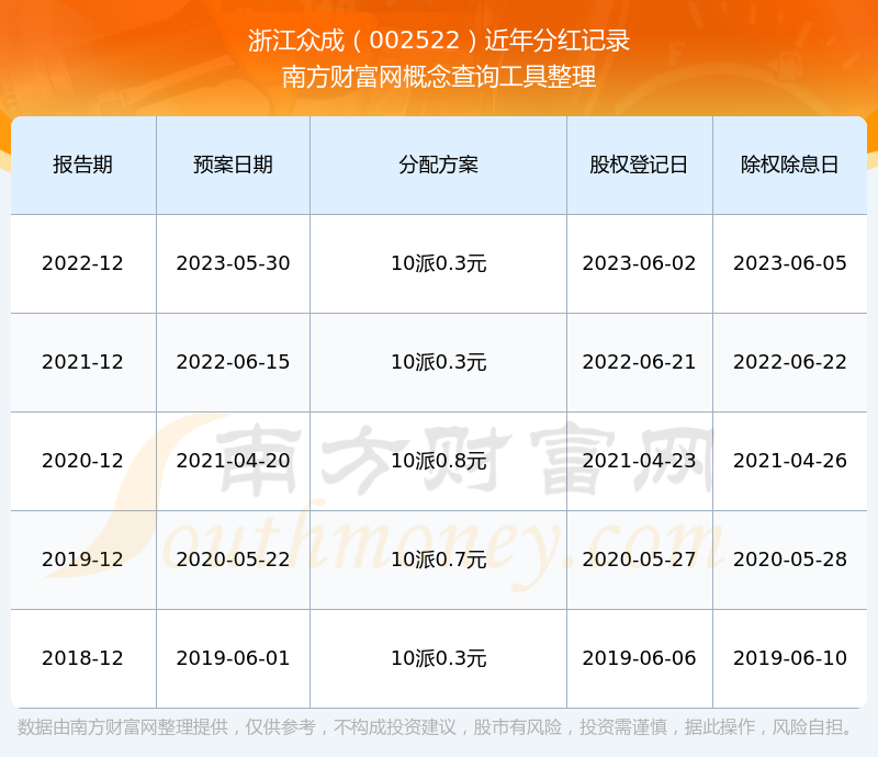浙江眾成最新一次公布的分紅方案為10派0.3元。本次權(quán)益分派股權(quán)登記日為2023年6月2日,除權(quán)除息日為2023年6月5日,派息日為2023年6月5日。