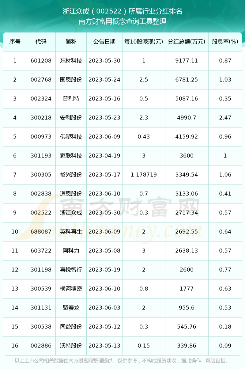 按照南方財(cái)富網(wǎng)趨勢(shì)選股系統(tǒng)統(tǒng)計(jì),浙江眾成所屬行業(yè)為塑料制品行業(yè),塑料制品行業(yè)分紅排名情況如下表: