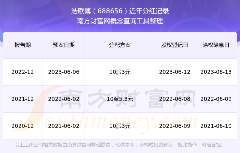浩歐博最新一次公布的分紅方案為10派3元。本次權(quán)益分派股權(quán)登記日為2023年6月12日,除權(quán)除息日為2023年6月13日,派息日為2023年6月13日。