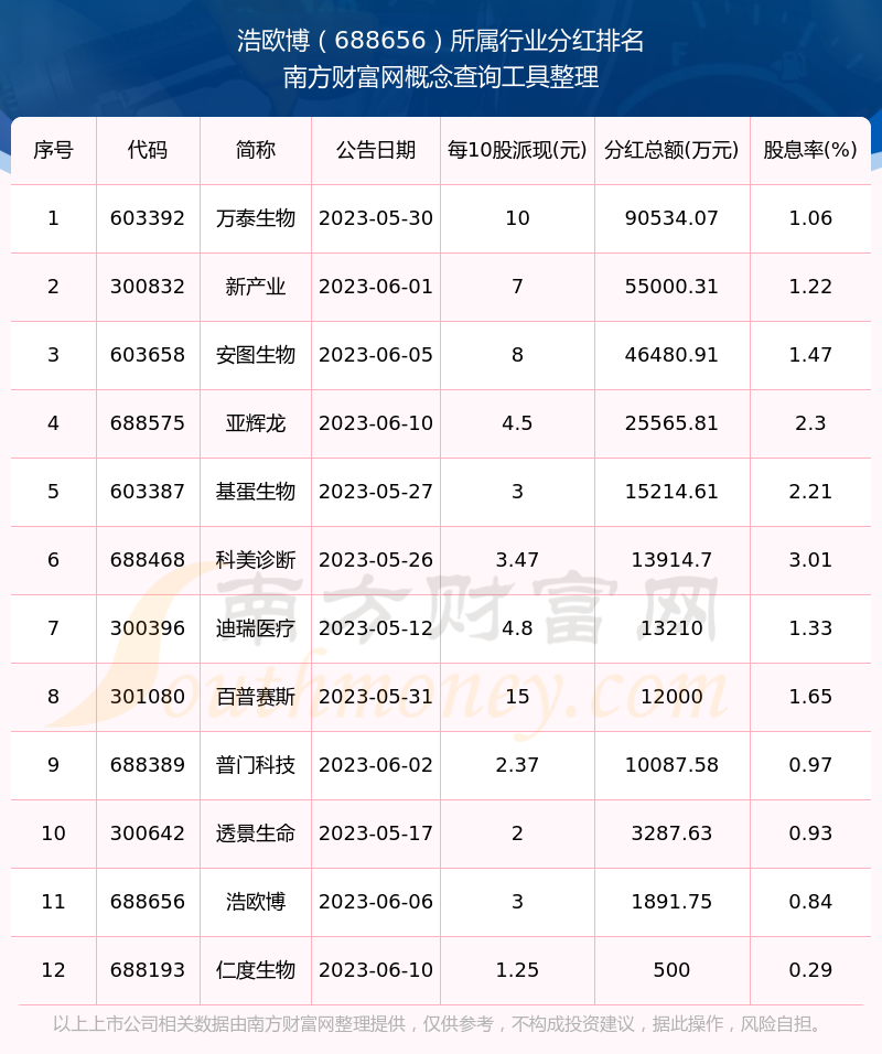 按照南方財(cái)富網(wǎng)趨勢(shì)選股系統(tǒng)統(tǒng)計(jì),浩歐博所屬行業(yè)為試劑行業(yè),試劑行業(yè)分紅排名情況如下表: