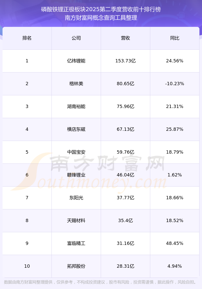 按照南方財富網(wǎng)概念查詢工具統(tǒng)計,該股所屬板塊為磷酸鐵鋰正極板塊,該板塊共有26只股票,龍蟠科技2025第二季度營收在該板塊中排名為第13名,該板塊2025第二季度營收排名前十的股票如下表: