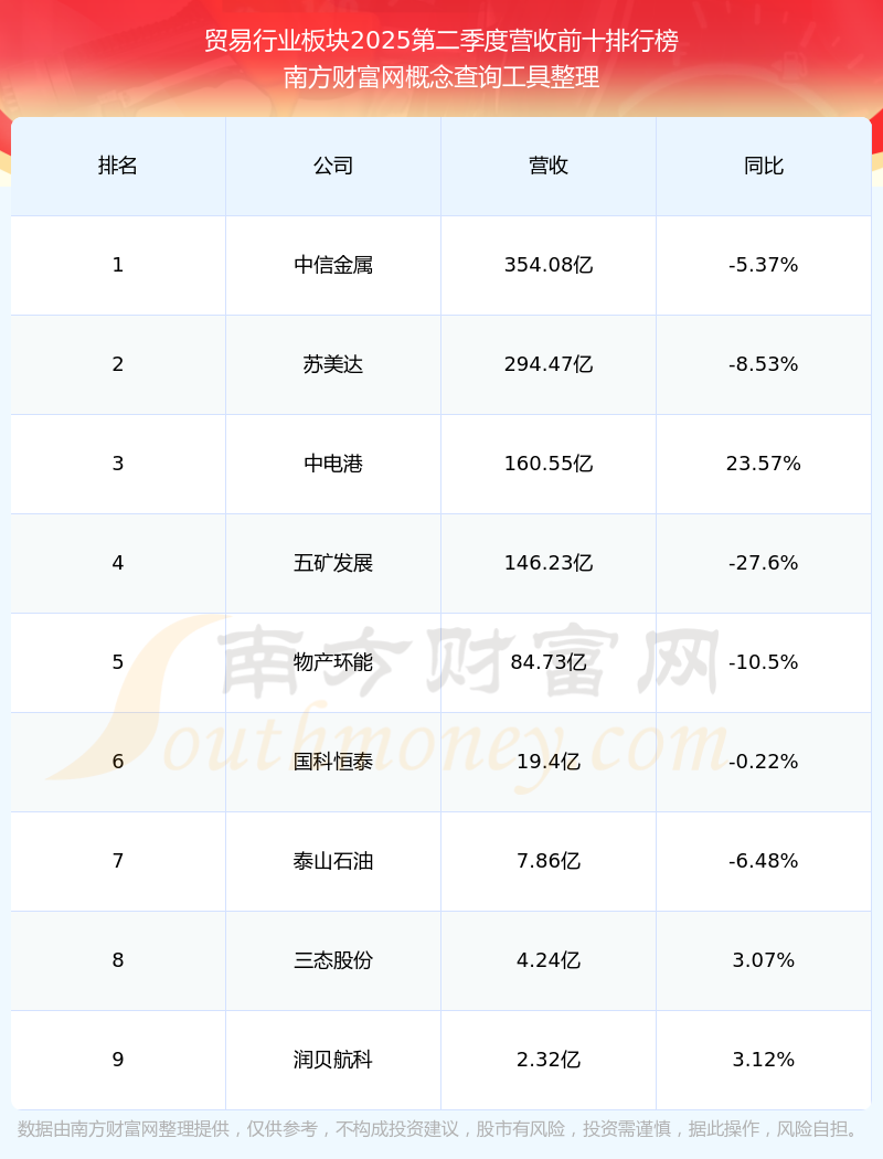 按照南方財富網(wǎng)概念查詢工具統(tǒng)計,該股所屬板塊為貿(mào)易行業(yè)板塊,該板塊共有9只股票,匯鴻集團2025第二季度營收在該板塊中排名為第9名,該板塊2025第二季度營收排名前十的股票如下表: