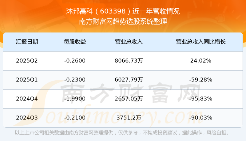 沐邦高科2025年第二季度財(cái)報(bào)顯示,公司主營(yíng)收入8066.73萬(wàn)元,同比24.02%;歸母凈利潤(rùn)-1.13億元,同比15.52%;扣非凈利潤(rùn)-1.09億元,同比18.6%。