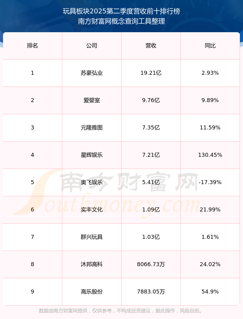按照南方財(cái)富網(wǎng)概念查詢工具統(tǒng)計(jì),該股所屬板塊為玩具板塊,該板塊共有9只股票,沐邦高科2025第二季度營(yíng)收在該板塊中排名為第8名,該板塊2025第二季度營(yíng)收排名前十的股票如下表: