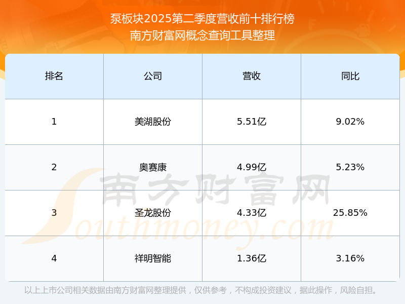 按照南方財(cái)富網(wǎng)概念查詢工具統(tǒng)計(jì),該股所屬板塊為泵板塊,該板塊共有4只股票,君禾股份2025第二季度營收在該板塊中排名為第4名,該板塊2025第二季度營收排名前十的股票如下表: