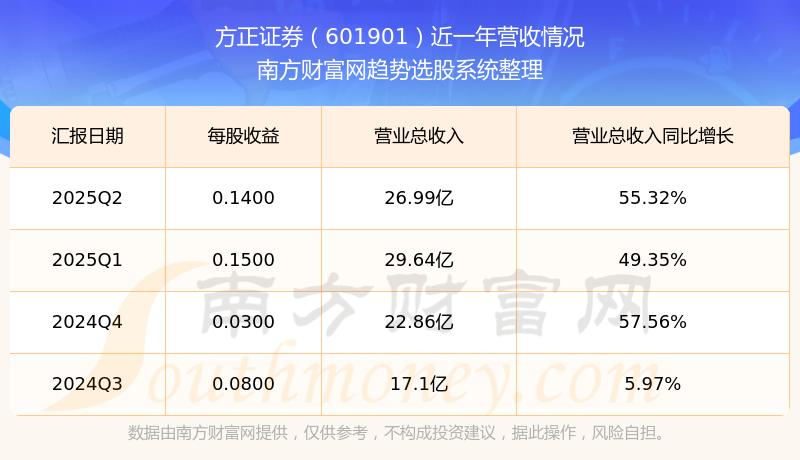 方正證券披露了2025年第二季度財(cái)報(bào)。報(bào)告顯示,方正證券2025年第二季度實(shí)現(xiàn)營收26.99億元,同比55.32%;歸母凈利潤11.89億元,同比109.71%。