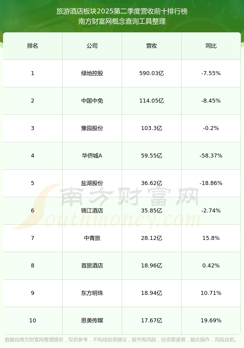 按照南方財富網(wǎng)概念查詢工具統(tǒng)計,該股所屬板塊為旅游酒店板塊,該板塊共有69只股票,中青旅2025第二季度營收在該板塊中排名為第7名,該板塊2025第二季度營收排名前十的股票如下表: