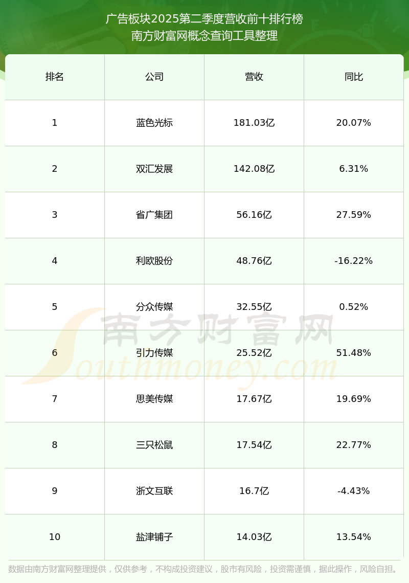 按照南方財(cái)富網(wǎng)概念查詢工具統(tǒng)計(jì),該股所屬板塊為廣告板塊,該板塊共有20只股票,龍韻股份2025第二季度營收在該板塊中排名為第18名,該板塊2025第二季度營收排名前十的股票如下表: