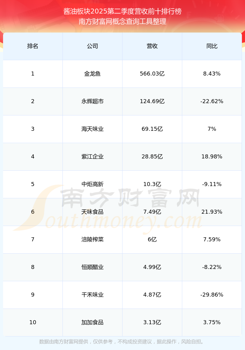 按照南方財(cái)富網(wǎng)概念查詢工具統(tǒng)計(jì),該股所屬板塊為醬油板塊,該板塊共有11只股票,千禾味業(yè)2025第二季度營收在該板塊中排名為第9名,該板塊2025第二季度營收排名前十的股票如下表:
