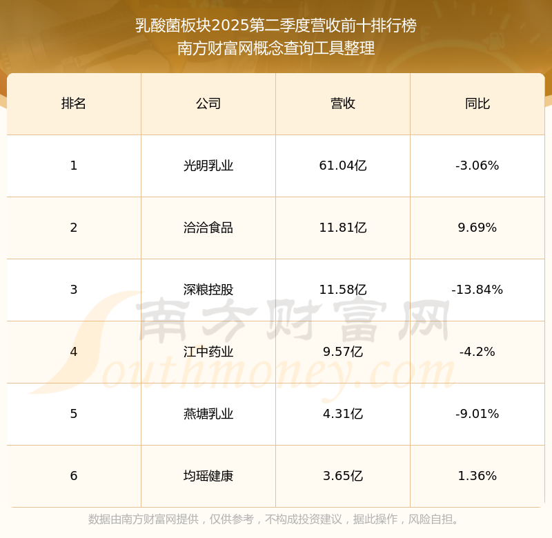 按照南方財(cái)富網(wǎng)概念查詢工具統(tǒng)計(jì),該股所屬板塊為乳酸菌板塊,該板塊共有6只股票,均瑤健康2025第二季度營(yíng)收在該板塊中排名為第6名,該板塊2025第二季度營(yíng)收排名前十的股票如下表: