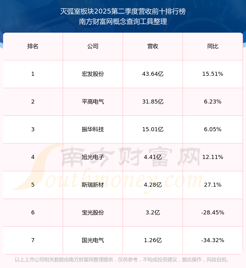 按照南方財富網(wǎng)概念查詢工具統(tǒng)計,該股所屬板塊為滅弧室板塊,該板塊共有7只股票,寶光股份2025第二季度營收在該板塊中排名為第6名,該板塊2025第二季度營收排名前十的股票如下表: