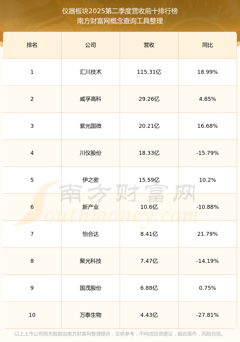 按照南方財(cái)富網(wǎng)概念查詢工具統(tǒng)計(jì),該股所屬板塊為儀器板塊,該板塊共有24只股票,坤恒順維2025第二季度營(yíng)收在該板塊中排名為第24名,該板塊2025第二季度營(yíng)收排名前十的股票如下表:
