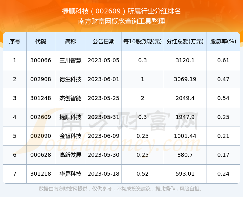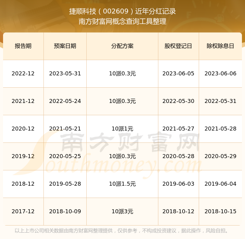捷順科技最新一次公布的分紅方案:10派0.3元。