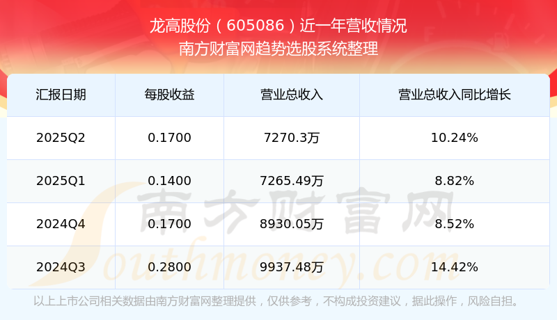 龍高股份2025年第二季度顯示,公司主營(yíng)收入7270.3萬(wàn)元,同比10.24%;歸母凈利潤(rùn)3004.35萬(wàn)元,同比45.85%;扣非凈利潤(rùn)2707.98萬(wàn)元,同比50.14%;