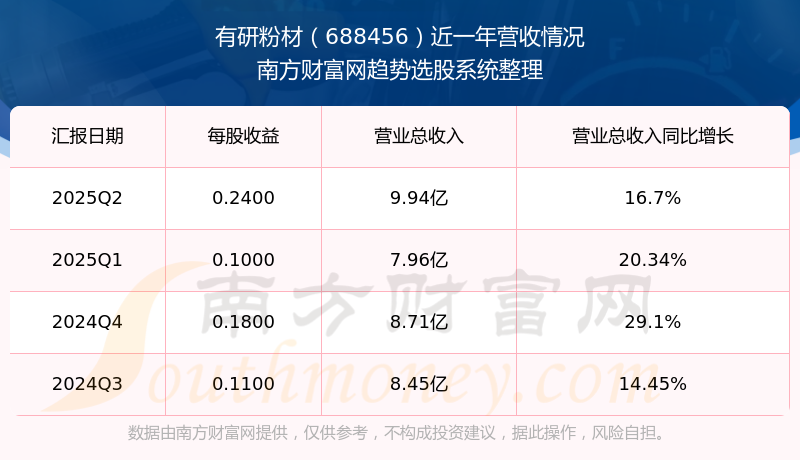 有研粉材2025年第二季度財報顯示,公司主營收入9.94億元,同比16.7%;歸母凈利潤2542.32萬元,同比29.65%;扣非凈利潤2054.2萬元,同比23.98%。