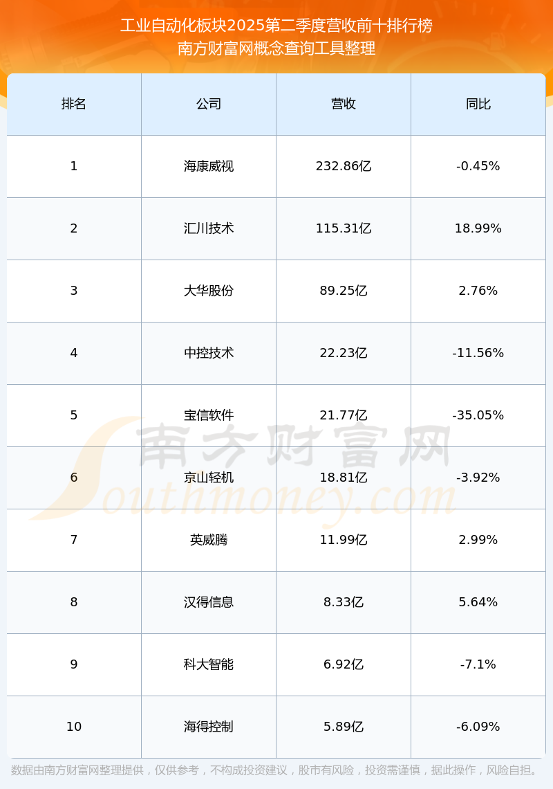 按照南方財富網(wǎng)概念查詢工具統(tǒng)計,該股所屬板塊為工業(yè)自動化板塊,該板塊共有23只股票,派斯林2025第二季度營收在該板塊中排名為第23名,該板塊2025第二季度營收排名前十的股票如下表: