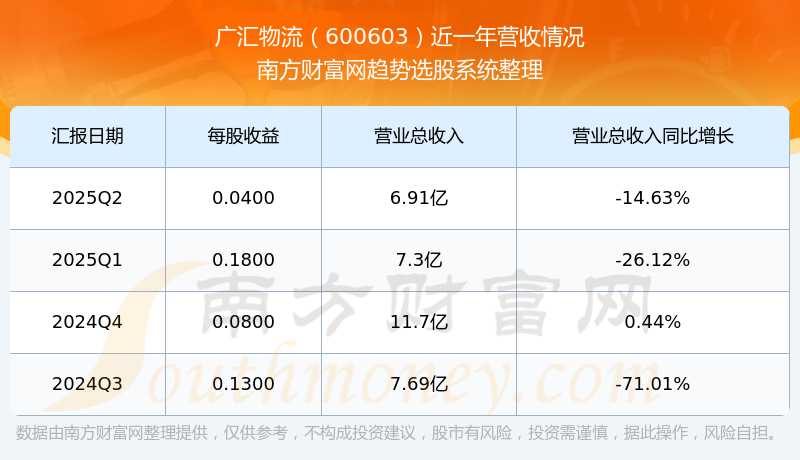 廣匯物流披露了2025年第二季度財(cái)報(bào)。報(bào)告顯示,廣匯物流2025年第二季度實(shí)現(xiàn)營收6.91億元,同比-14.63%;歸母凈利潤5294.51萬元,同比-8.29%。