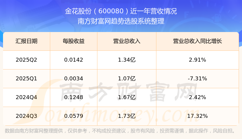 在2025年第二季度,金花股份的業(yè)績表現(xiàn),主營業(yè)務收入達到1.34億元,實現(xiàn)了2.91%的同比增長率。同時,公司歸母凈利潤錄得497.97萬元,同比增長134.34%。