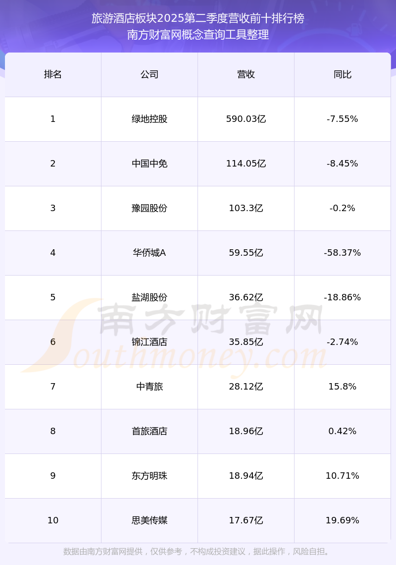按照南方財富網概念查詢工具統計,該股所屬板塊為旅游酒店板塊,該板塊共有69只股票,中國中免2025第二季度營收在該板塊中排名為第2名,該板塊2025第二季度營收排名前十的股票如下表: