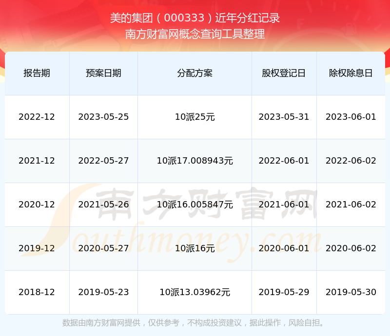 美的集團最新一次公布的分紅方案為10派25元。本次權益分派股權登記日為2023年5月31日,除權除息日為2023年6月1日,派息日為2023年6月1日。