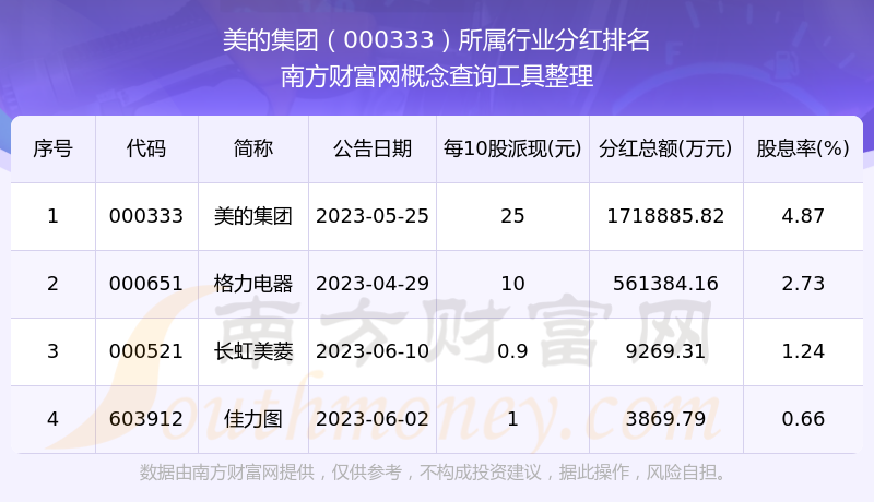 按照南方財富網(wǎng)趨勢選股系統(tǒng)統(tǒng)計,美的集團所屬行業(yè)為空調行業(yè),空調行業(yè)分紅排名情況如下表: