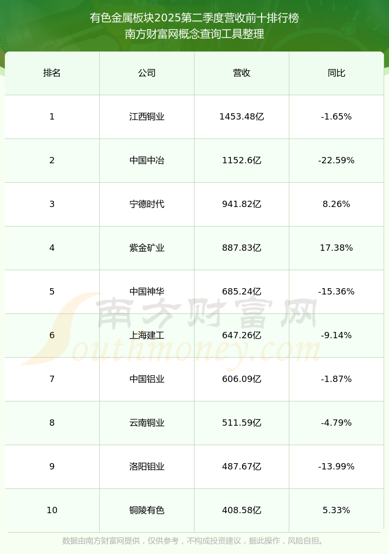 按照南方財(cái)富網(wǎng)概念查詢工具統(tǒng)計(jì),該股所屬板塊為有色金屬板塊,該板塊共有289只股票,福達(dá)合金2025第二季度營(yíng)收在該板塊中排名為第160名,該板塊2025第二季度營(yíng)收排名前十的股票如下表: