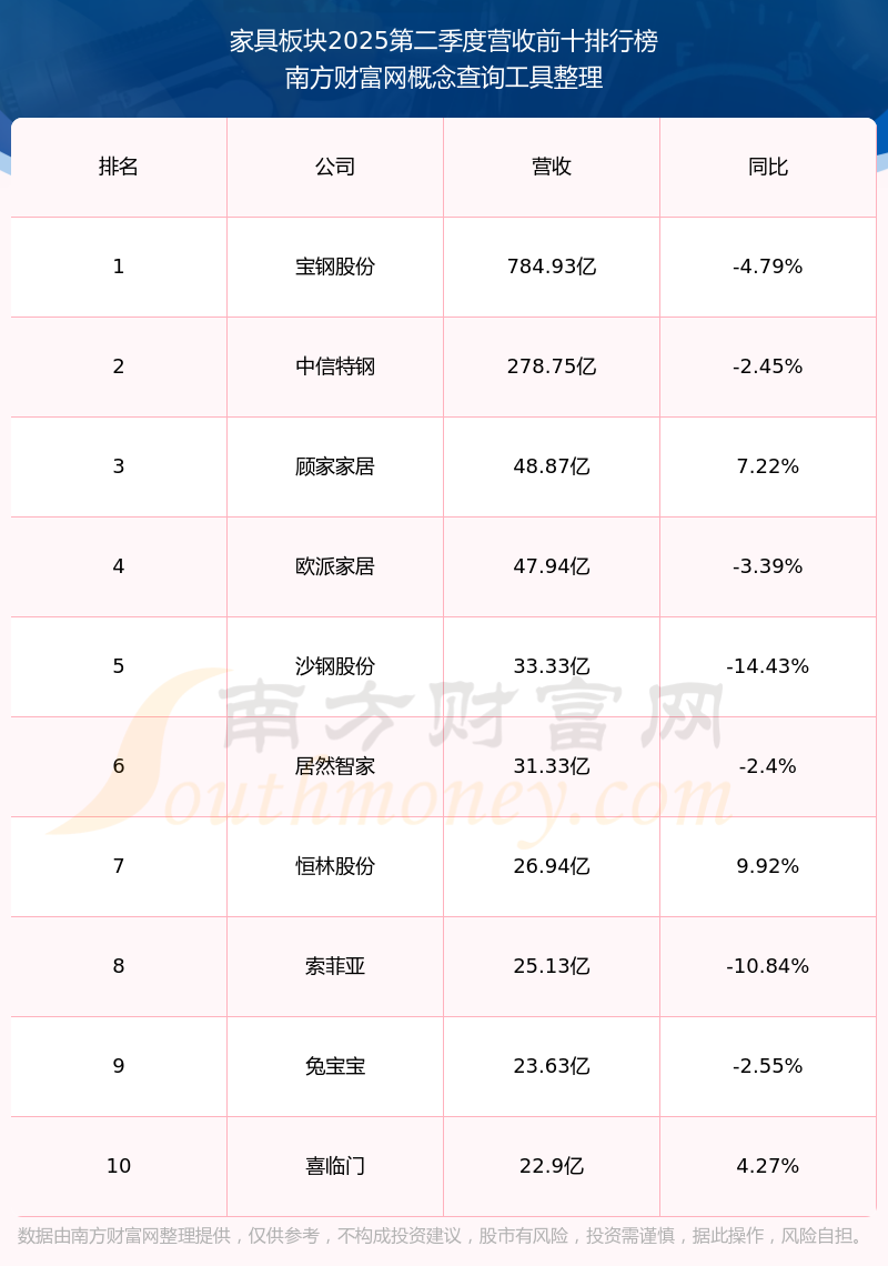 按照南方財富網(wǎng)概念查詢工具統(tǒng)計,該股所屬板塊為家具板塊,該板塊共有55只股票,曲美家居2025第二季度營收在該板塊中排名為第24名,該板塊2025第二季度營收排名前十的股票如下表: