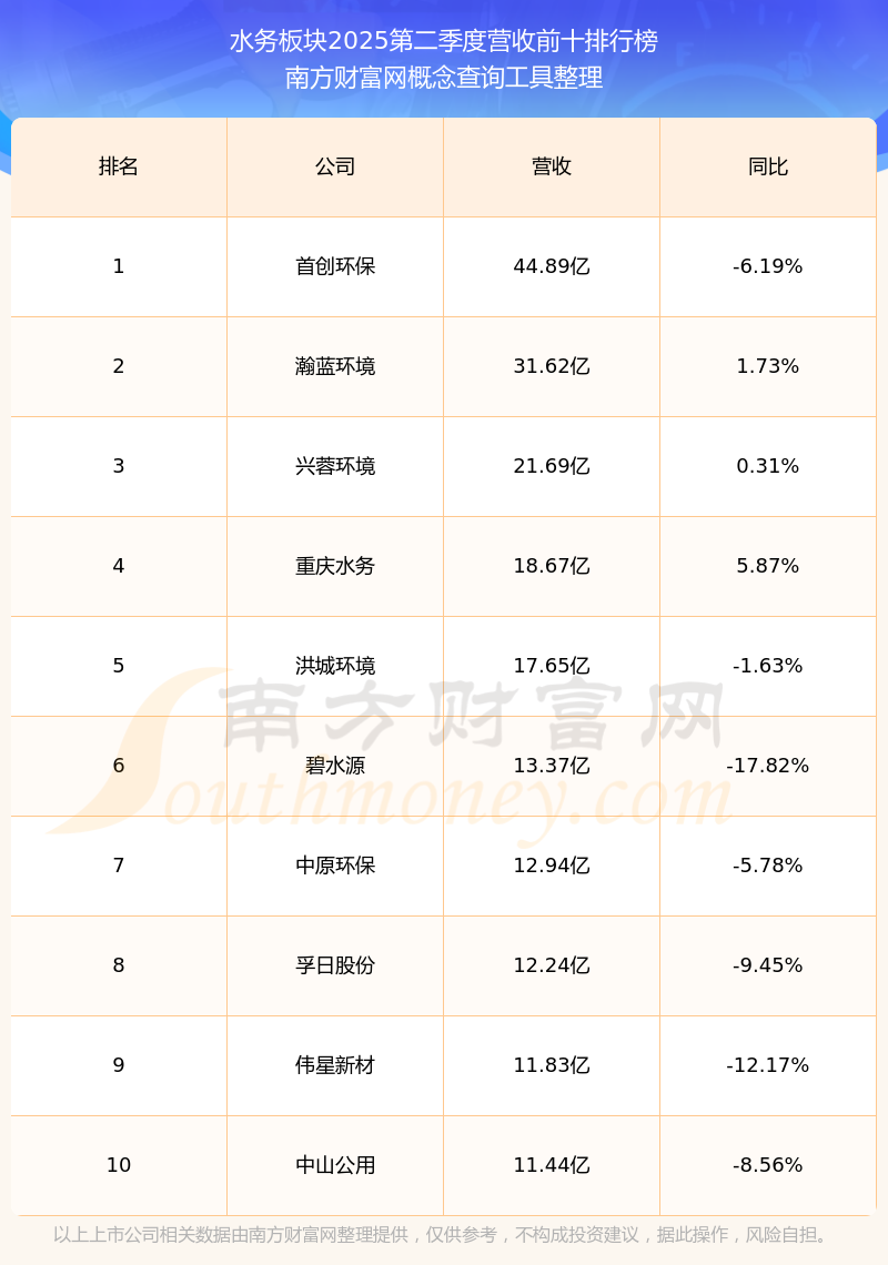 按照南方財(cái)富網(wǎng)概念查詢工具統(tǒng)計(jì),該股所屬板塊為水務(wù)板塊,該板塊共有49只股票,三達(dá)膜2025第二季度營(yíng)收在該板塊中排名為第49名,該板塊2025第二季度營(yíng)收排名前十的股票如下表: